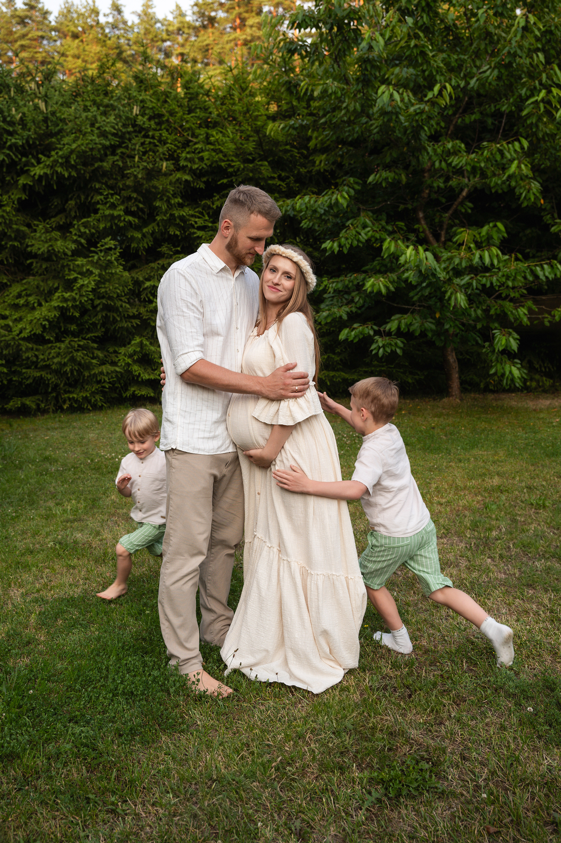 Sesja rodzinna i brzuszkowa łączyła emocje i spokój. Chłopcy byli jak wulkan energii, ale dzięki dobrej organizacji udało się uchwycić zarówno momenty rodzinne, jak i te związane z oczekiwaniem na dziecko.